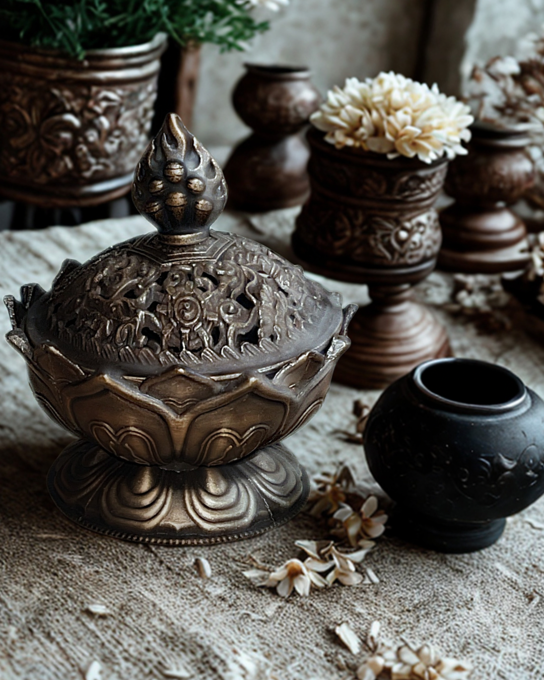 Un brûleur d’encens délicatement façonné en lotus, symbole d’élévation et de pureté.