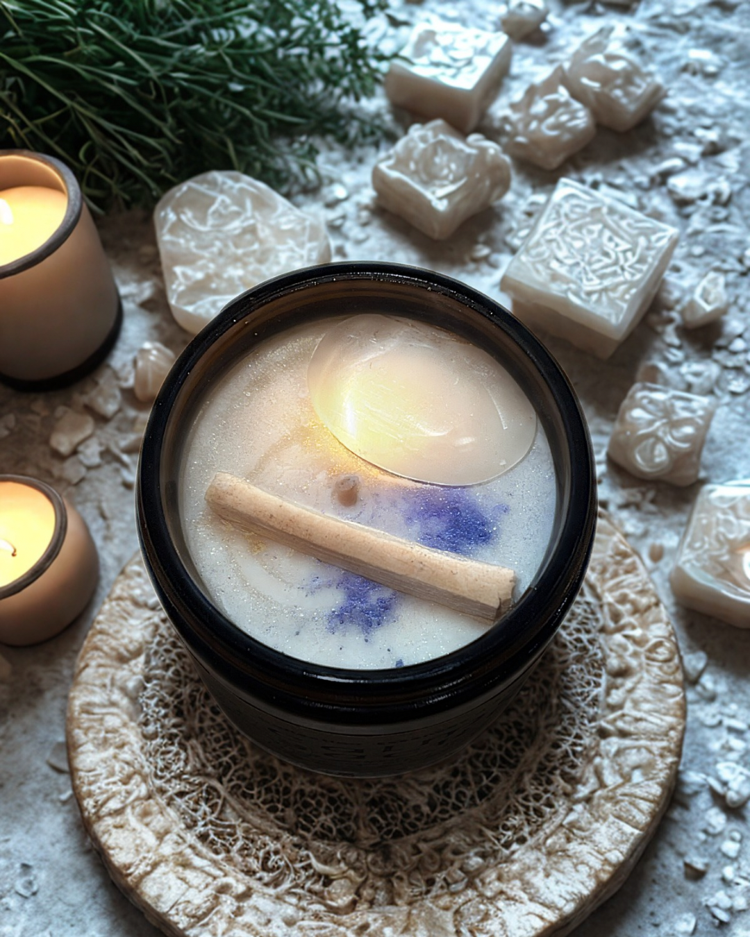 • Bougie Rituel avec Pierre (140 ml / 30 h) : Sélénite, Palo Santo et mantra pour purifier l’espace et recentrer l’énergie.